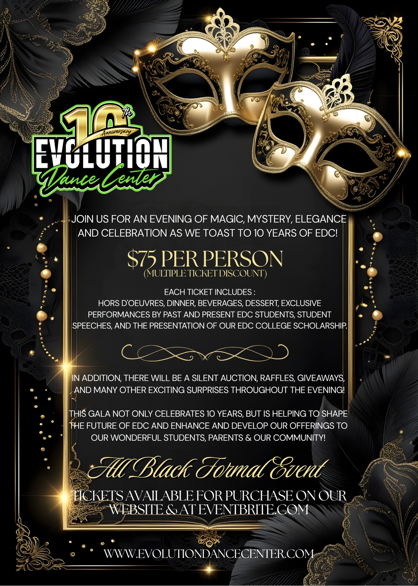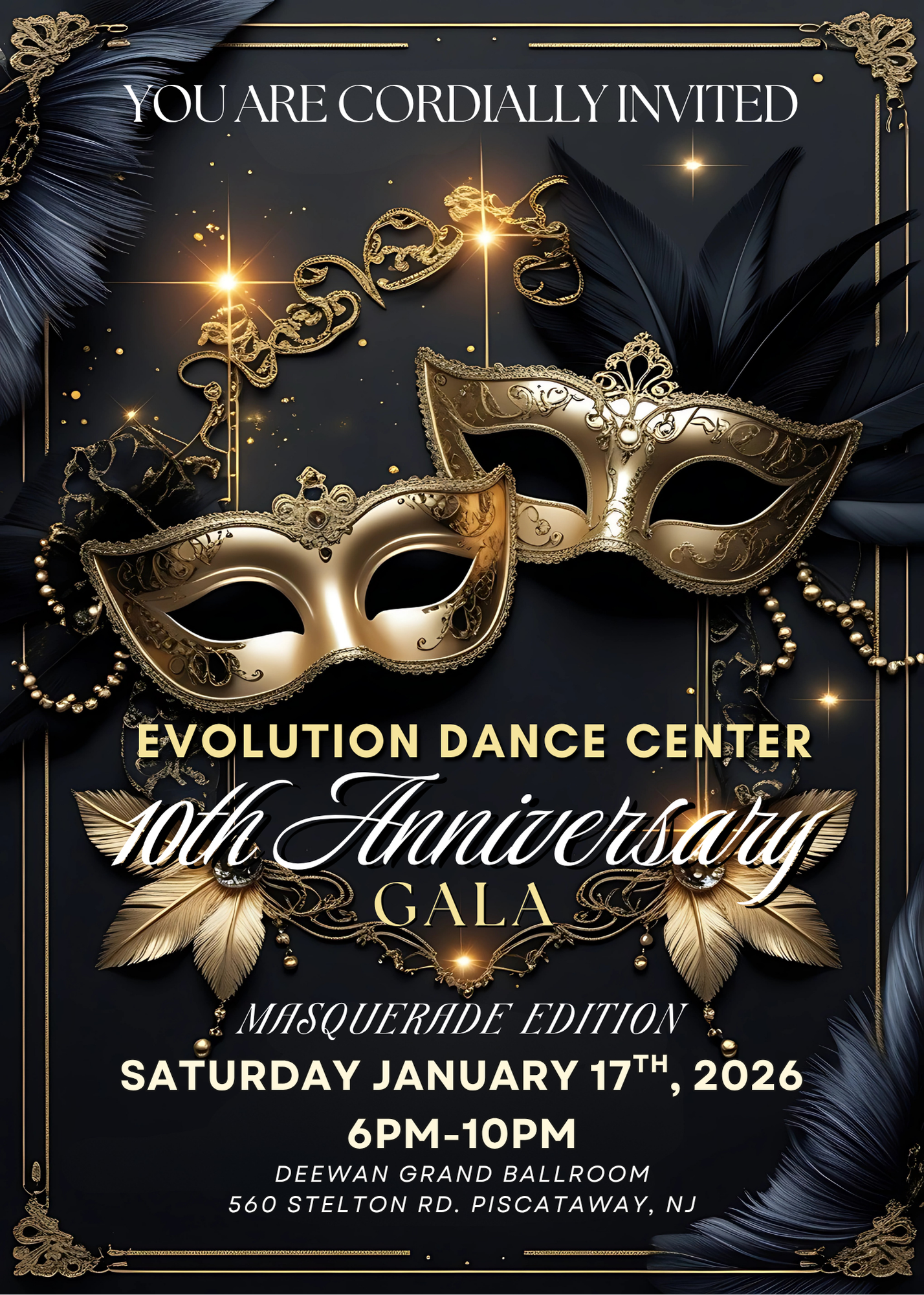 THE EVOLUTION DANCE CENTER 10TH ANNIVERSARY MASQUERADE GALA WILL BE HELD SATURDAY JANUARY 17TH AT THE DEWAAN GRAND BALLROOM IN PISCATAWAY. NJ.
