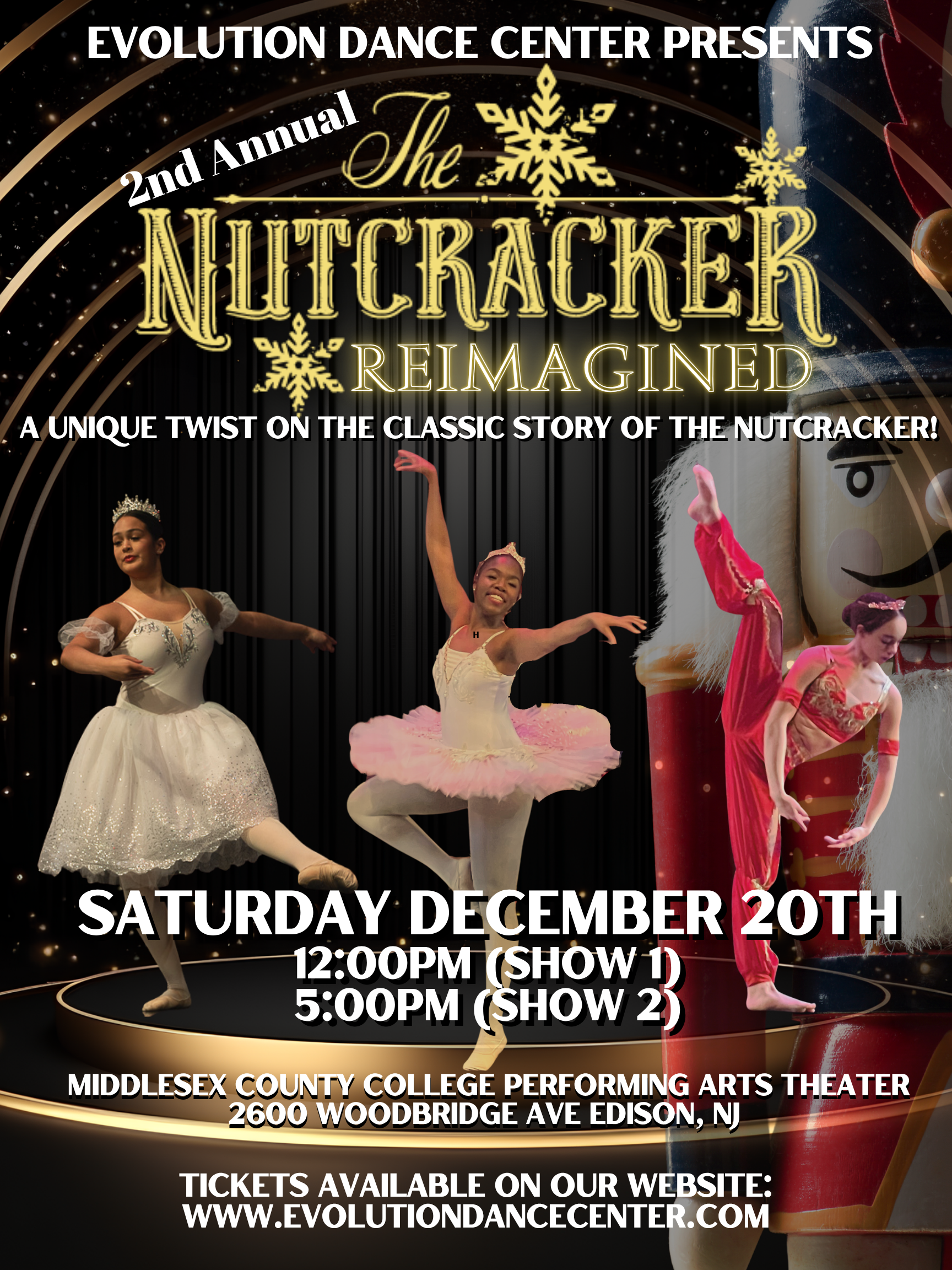 The Nutcracker Reimagined is an exciting, unique twist on the classic story of the Nutcracker, performed by the beautiful dancers of Evolution Dance Center! This one-of-a-kind production incorporates many styles of dance including ballet, pointe, hip hop, jazz, contemporary and acrobatics, with our own original script, music, costumes, guest performers, and vocalist!!